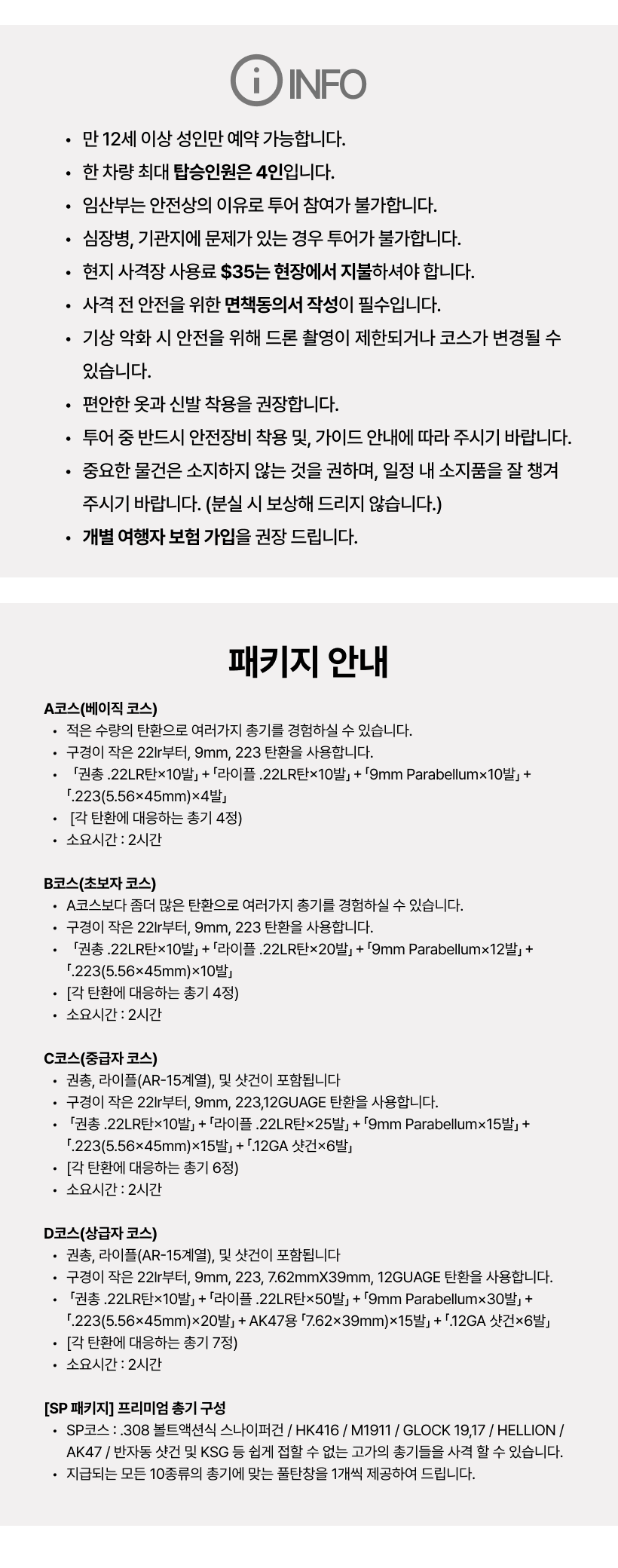 - 현지 사격장 사용료 $35는 현장에서 지불하셔야 합니다.