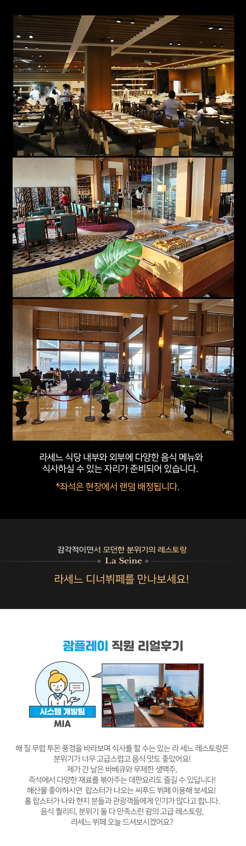 7/21 다녀왔습니다. 절대 비추입니다. 평도 좋고 한국 라세느 생각하고 기대하고 갔는데, 음식 관광호텔 뷔페 갔고, 자리도 사람 더 받으려고 로비에 편의점 같은 간이 테이블 잔득 만들어 놓아서 시장 같습니다. 그날 온가족이 저녁 기대하고 놀았는데 저녁 완전 망침. 이 값이면 헌지 맛집 가거나 같은 값이면 다른 호텔 뷔페 알아보세요.