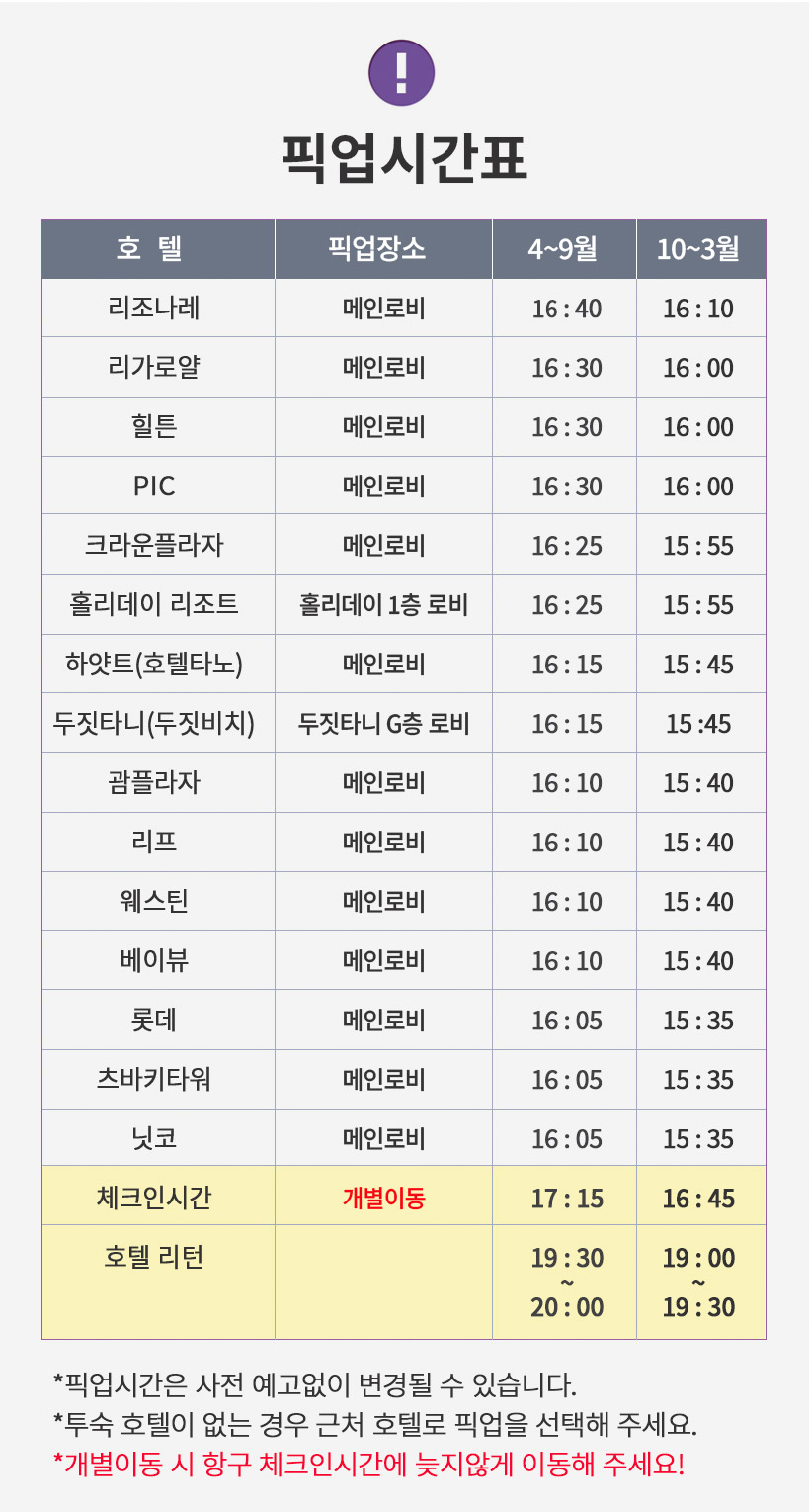 - 변경은 이용일기준 3일전까지 1회만 가능하며, 현지사정에 따라 변경이 불가할 수 있습니다.