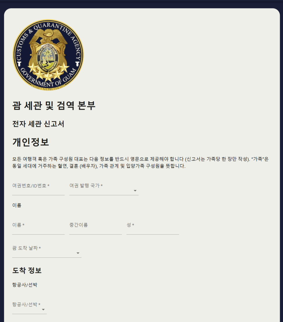 괌 세관청 공식 웹사이트 또는 QR 코드 스캔을 통해 접속할 수 있습니다. (입국 게이트나 항공사 안내문에서 QR 코드 확인 가능)