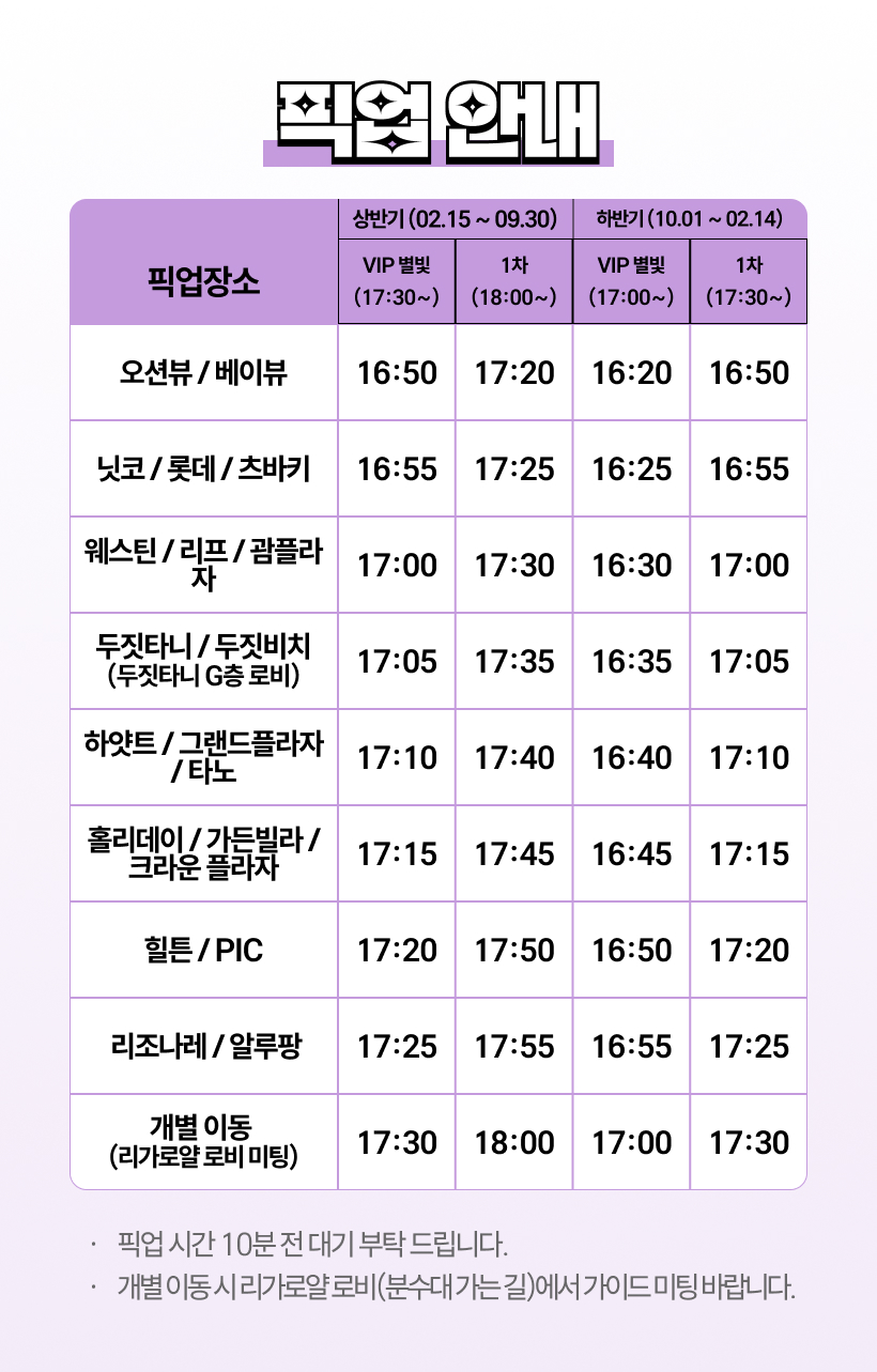 - 픽업시간은 현지 교통사정에 의해 조금 늦어질 수 있는 점 양해부탁드립니다.
