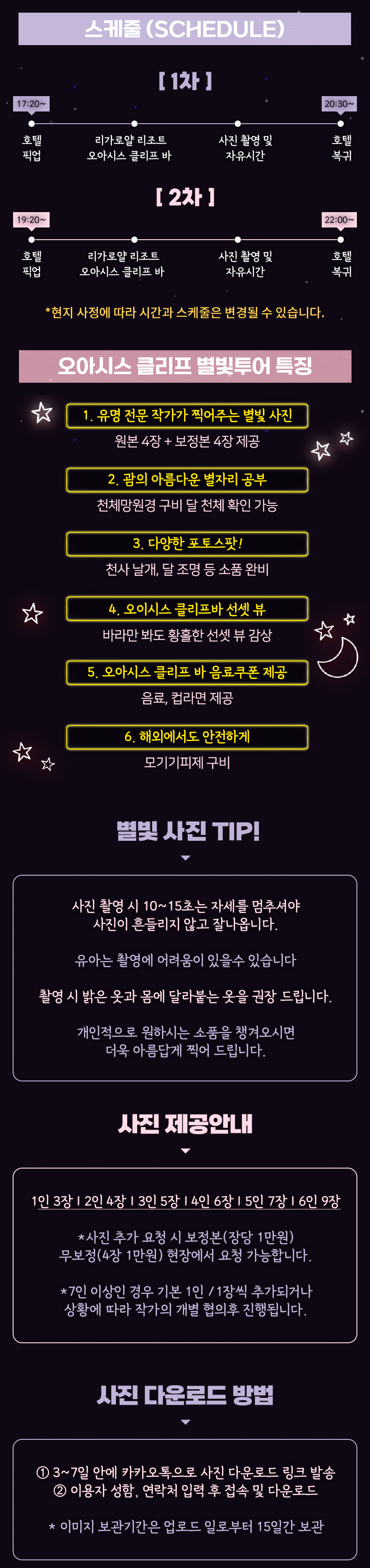 - 별빛투어 진행날짜, 차수, 픽업호텔 필수로 기재해주셔야 정상 예약 됩니다.