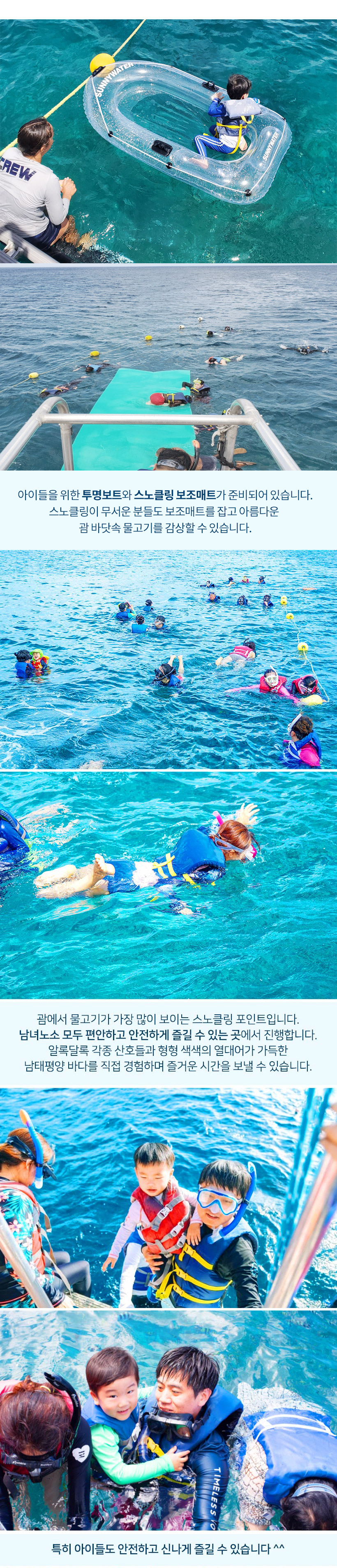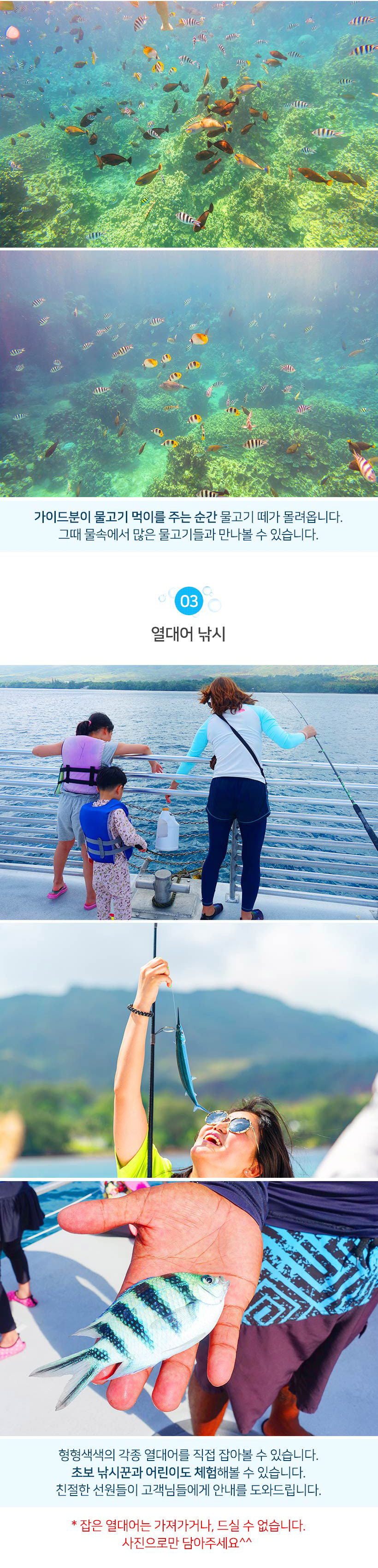 - 스노클링 및 낚시체험시 물고기에 물리거나 날카로운 산호에 다치지 않도록 개인안전에 주의바랍니다.