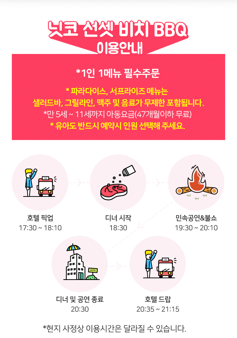 - 장소: 닛코 1층 수영장 옆 비치 (닛코는 로비층이 3층이므로 엘리베이터를 타고 내려가셔야합니다.)