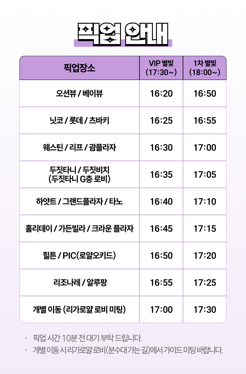 - 픽업시간은 현지 교통사정에 의해 조금 늦어질 수 있는 점 양해부탁드립니다.