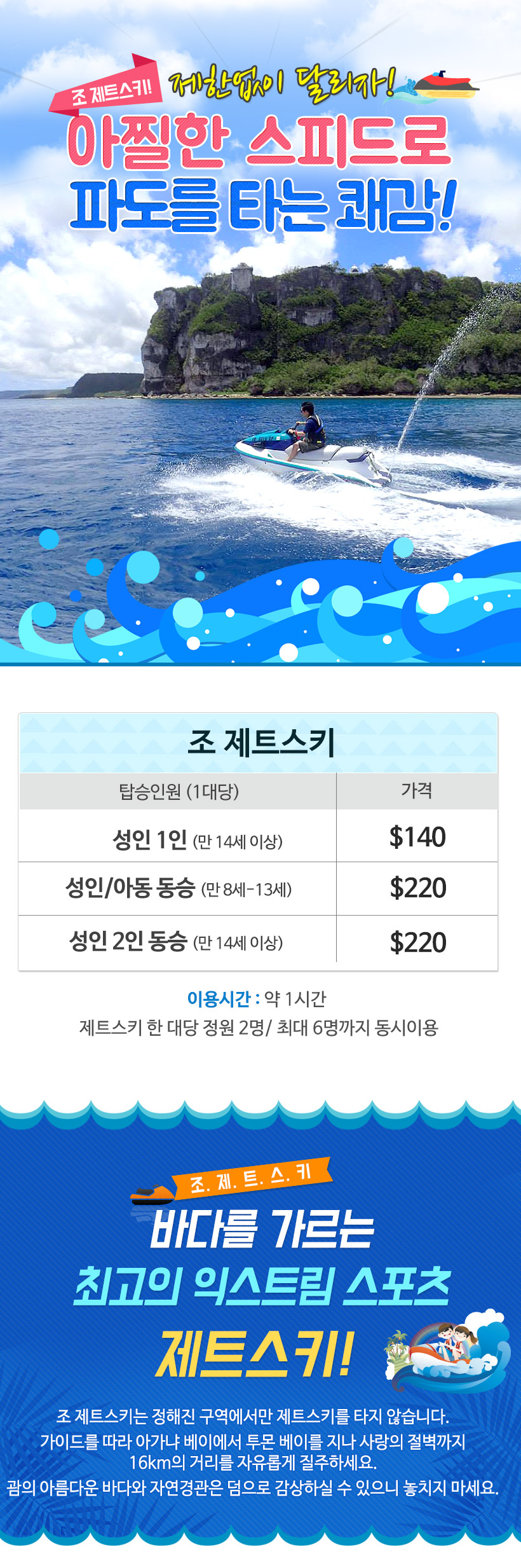 조 제트스키는 왕복 1시간가량 제트스키를 제대로 즐길 수 있는 전문 해양상품입니다.