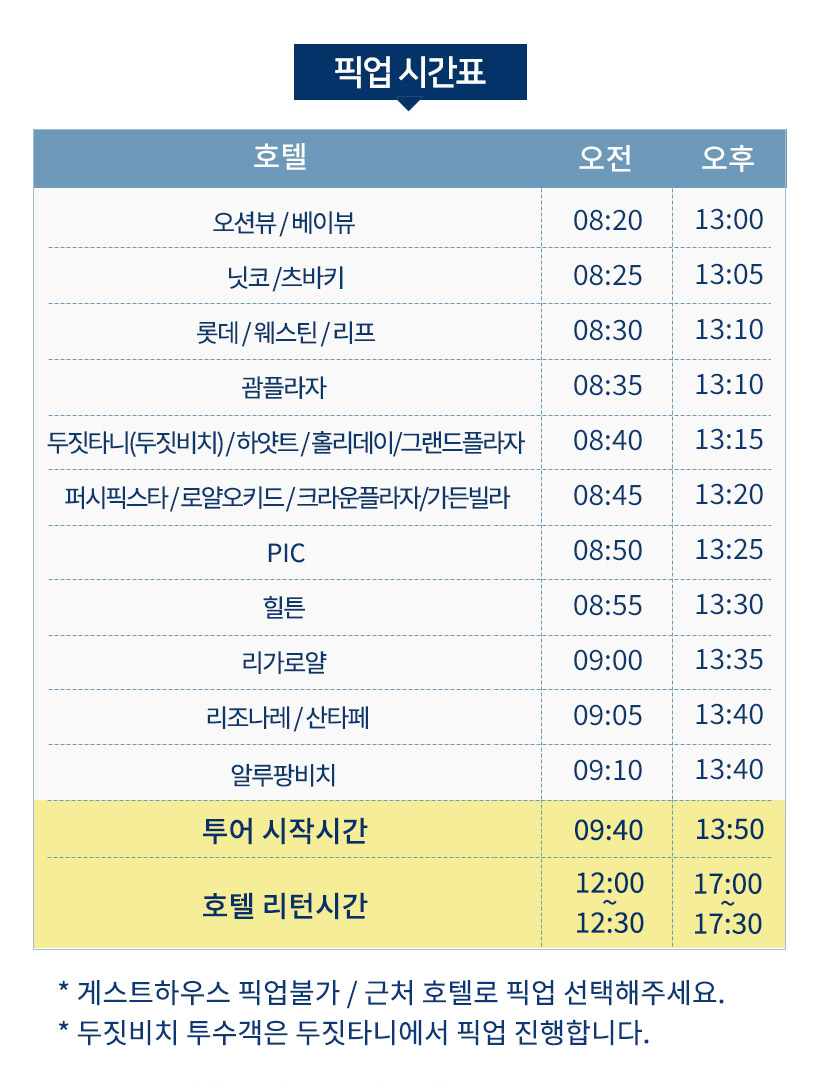 - 픽업시간은 현지 교통사정에 의해 조금 늦어질 수 있는 점 양해부탁드립니다.