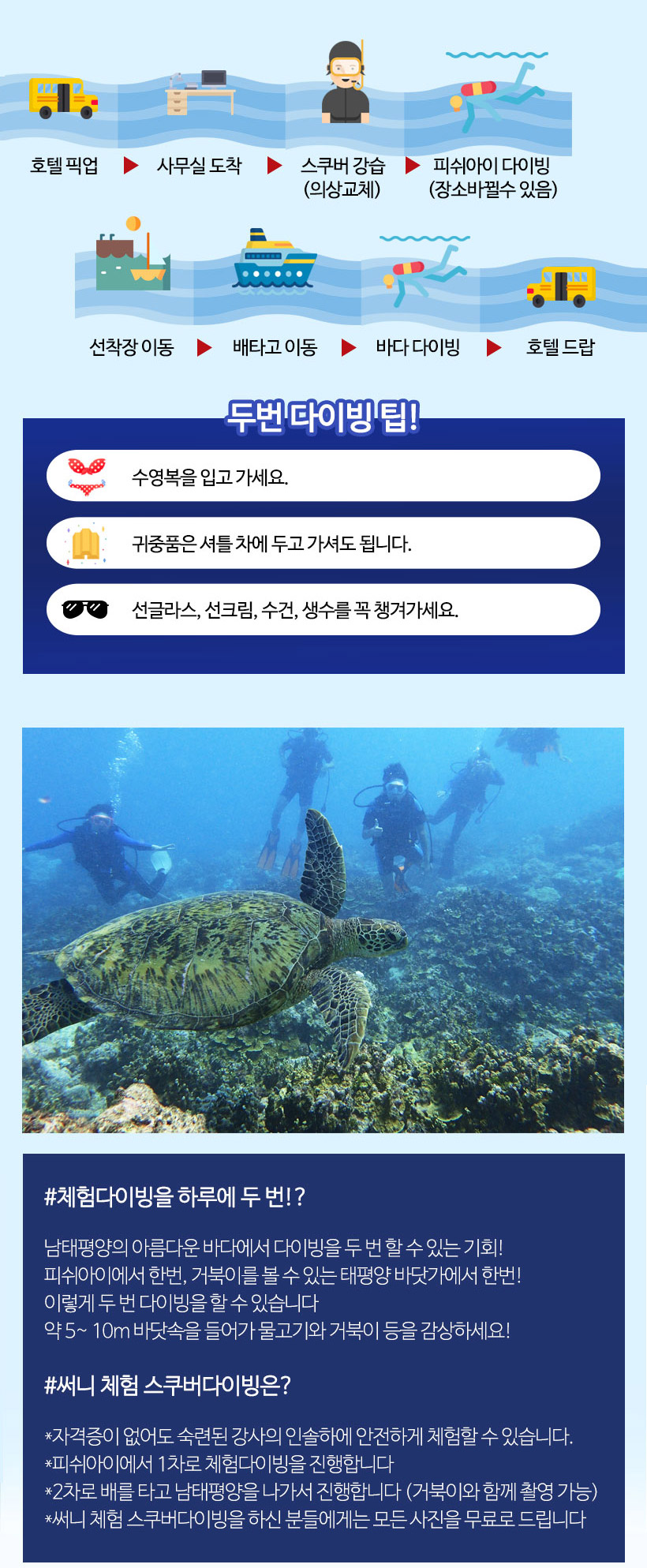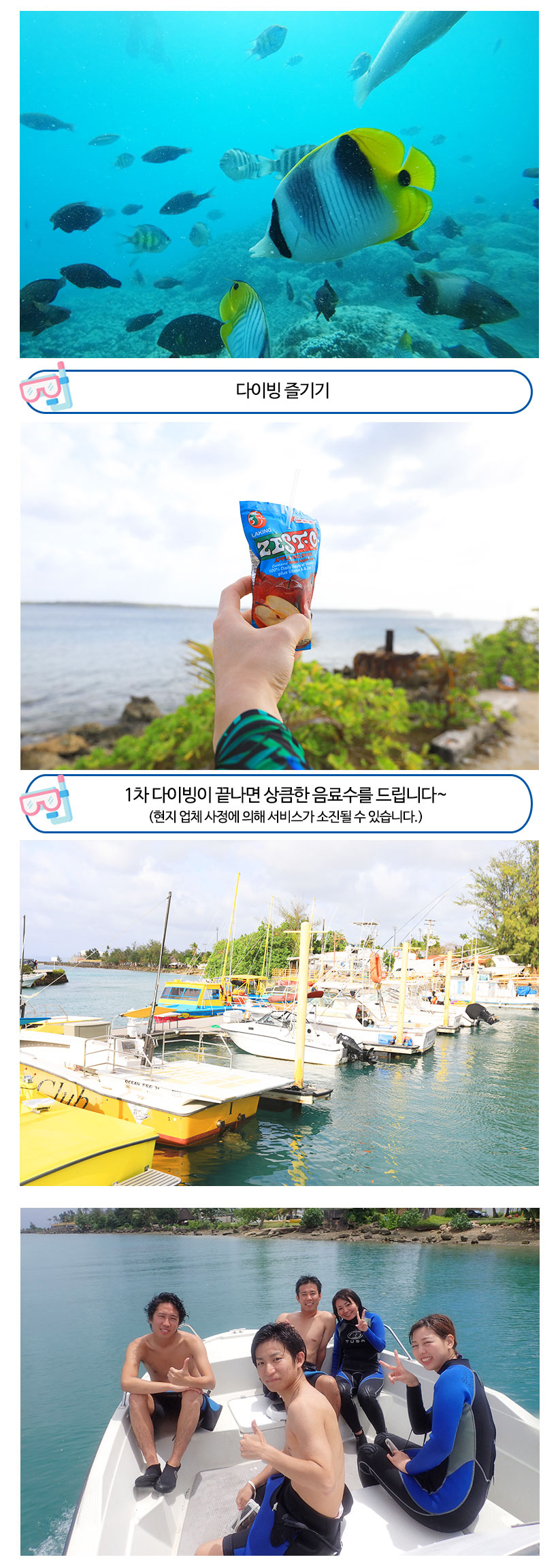 - 현지 바다 상황에 따라 스쿠버다이빙 장소가 변경 될 수 있습니다.