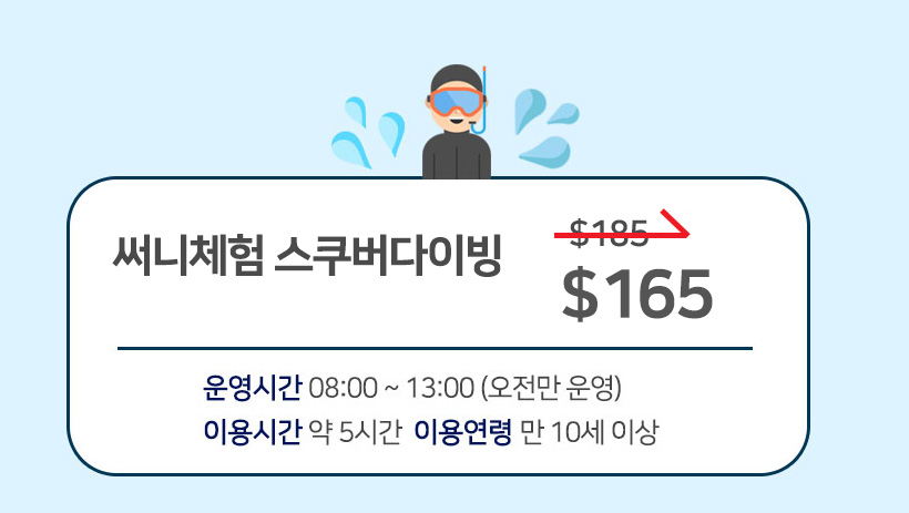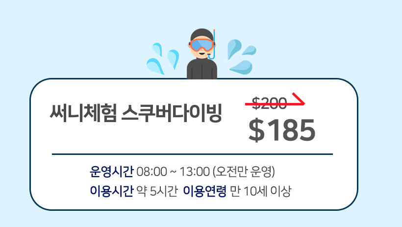 - 스쿠버 다이브는 임산부 또는 10세 미만의 어린이는 체험하실 수 없습니다.
