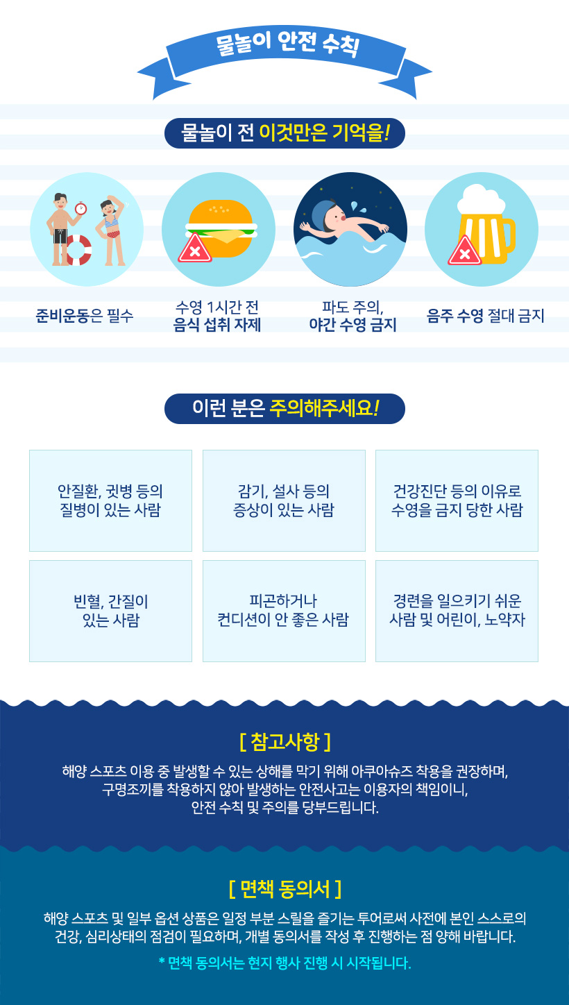 - 안전장비를 반드시 착용해야 하며 안전요원의 보호 없이 바다 뛰어드는 행위는 금지합니다.