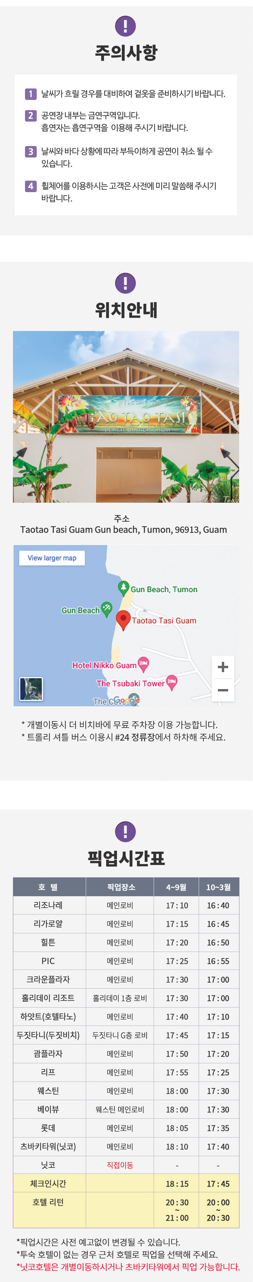 괌 플레이 통해서 예약하니 입장도 너무 빨랐고 주류 빼고는 따로 결제할 필요없이 너무 간편하게 잘 다녀왔어요 :)