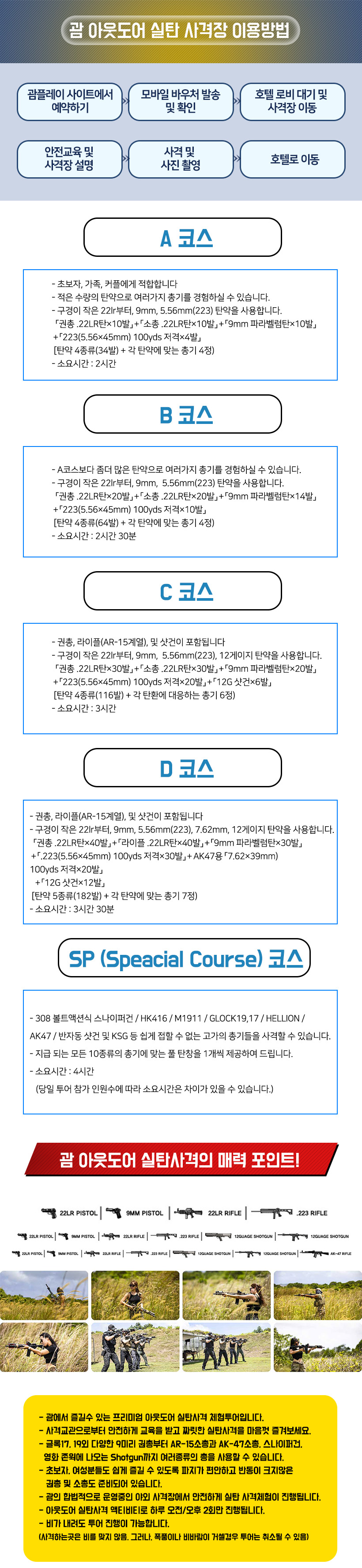 * 사격투어시 교관 또는 안전요원의 지시에 불응하거나 고객의 안전 확보가 현저히 어렵다고 판단되는 경우 그 즉시 투어는 종료되며 이용요금에 대한 환불은 없습니다.