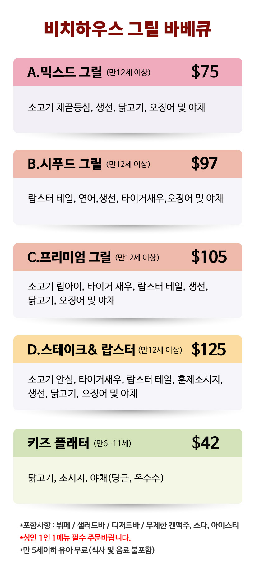 - 바베큐식사, 샐러드바, 무제한 생맥주 및 음료(소다,아이스티)