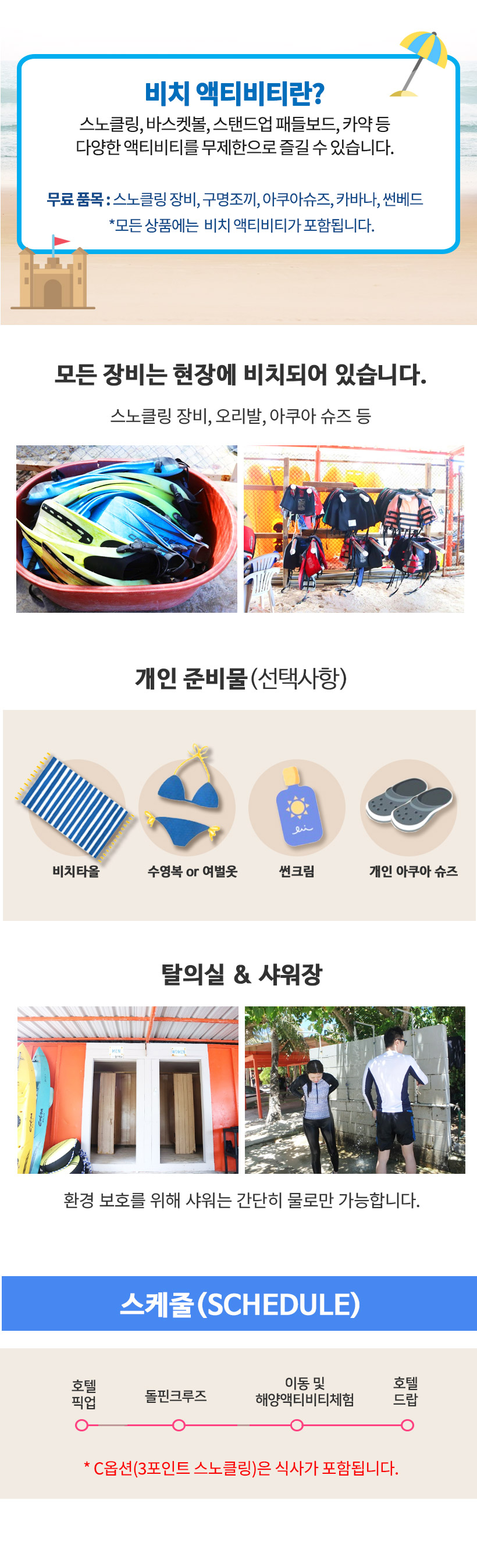 수건, 수영복, 아쿠아슈즈, 자외선차단제 등 개인용품