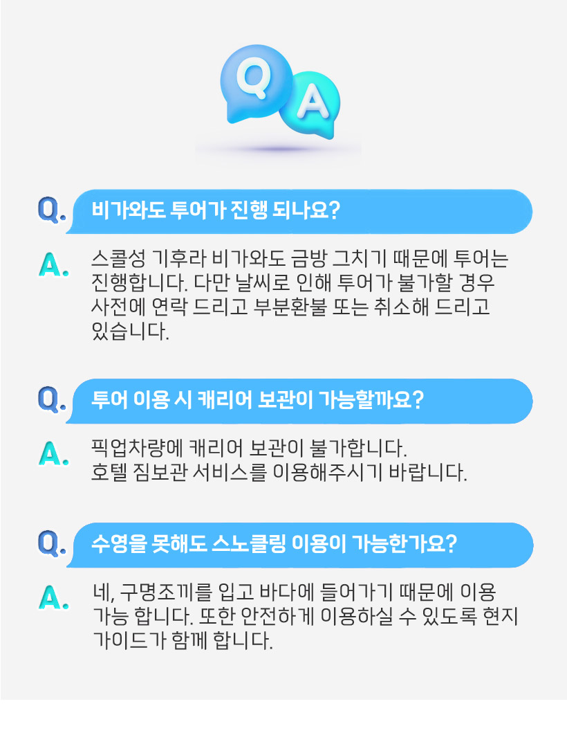 - 물고기에 물리거나 날카로운 산호에 다치지 않도록 개인안전에 주의하시기 바랍니다.