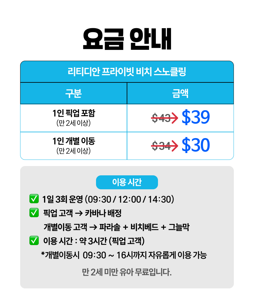 - 만 2세 미만은 무료입니다. (예약 시 인원수에 포함해 주세요)