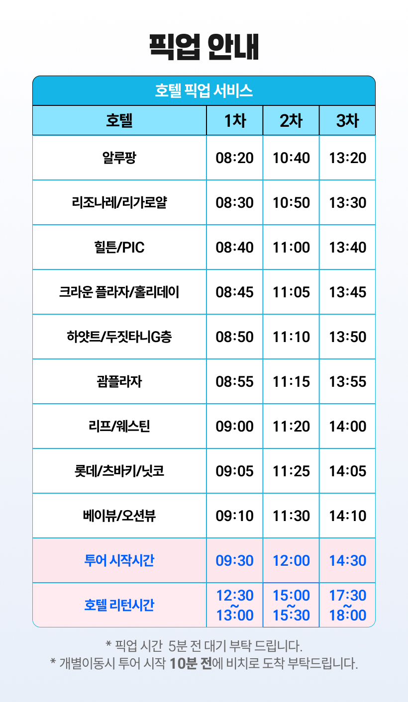약 4시간 (이동시간 포함, 호텔별 상이)