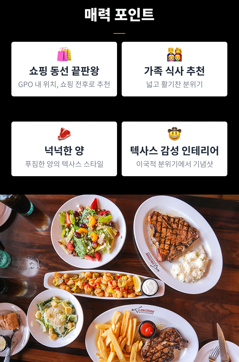 가족 여행 중 롱혼 스테이크하우스에서 가성비 좋은 식사로 만족스러운 시간을 보내셨다니 기쁩니다. 스테이크뿐만 아니라 와일드 웨스트 쉬림프까지 취향에 맞으셨다니 더 반가운 후기네요ㅎㅎ