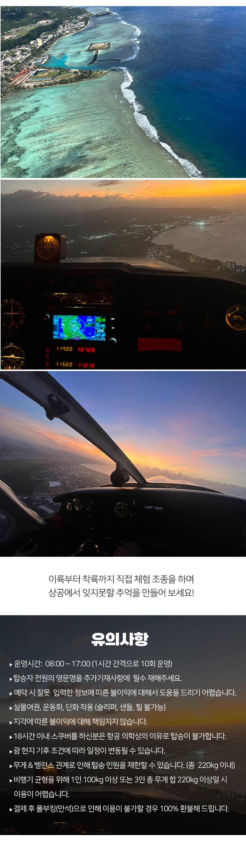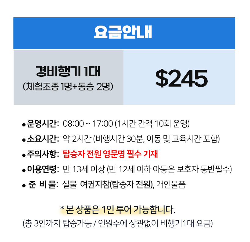 - 탑승 항공기는 조종사 포함 최대 4명까지 탑승이 가능합니다.