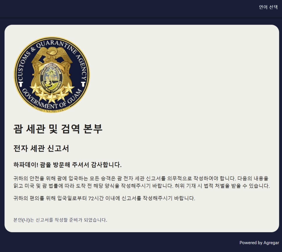 괌 세관청 공식 웹사이트 또는 QR 코드 스캔을 통해 접속할 수 있습니다. (입국 게이트나 항공사 안내문에서 QR 코드 확인 가능)