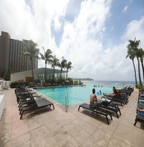 투몬 베이의 에메랄드빛 전경은 괌에서도 손꼽히는 절경으로 유명합니다. 수영장에서 내려다보는 바다 뷰는 다른 곳에서는 경험하기 어려운 특별한 순간을 선사할 거예요.