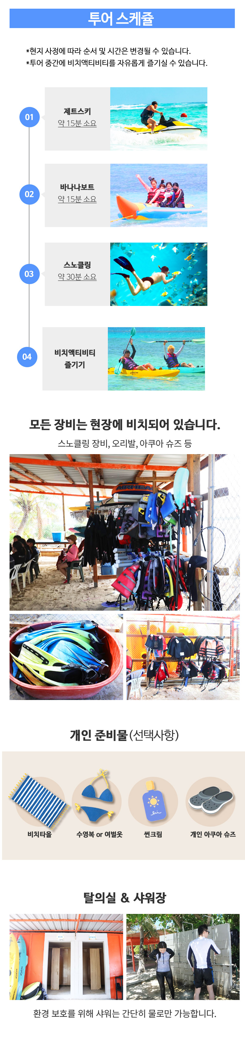 제트스키와 바나나보트는 재미있었지만 비용이 사악해서 가장 아쉬운 투어였습니다. 사장님은 너무 친절하셨어요. 제트스키와 바나나보토를 꼭 타고싶으신 분만 신청하시는게 좋겠어요. 스노쿨링은 별다른 이동없이 바다 옆 공간에서 자유롭게 하라는게 다소 아쉬웠습니다. (배타고 이동해서 핫 존에서 하는거라고 생각했어요) 상세페이지에는 3시간 코스라 써있지만 실상 1시간이면 끝나는 코스입니다.