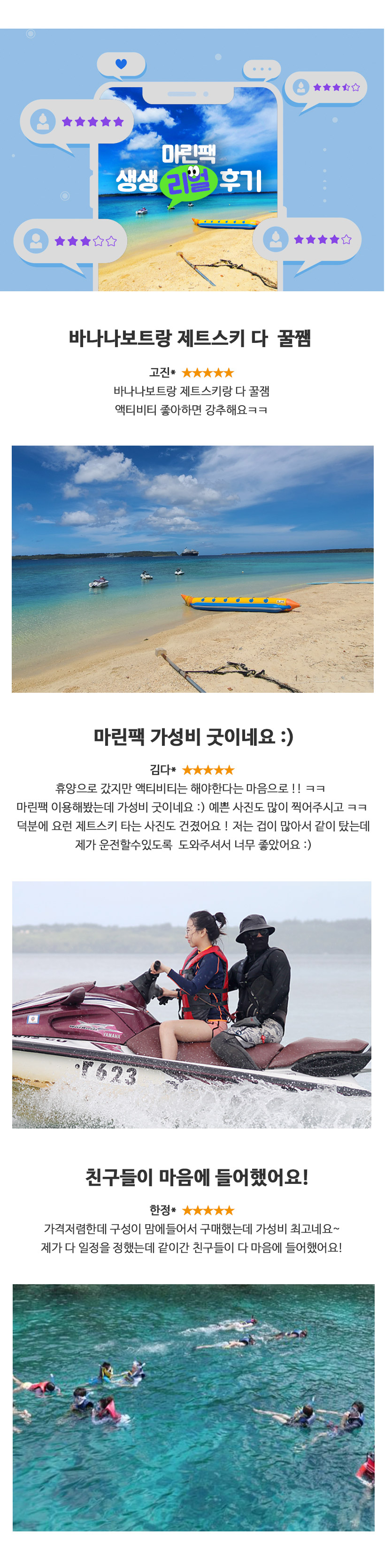 마린팩 너무 잼나요~ 제스트키랑 바나나보트 스노클링 했는데 스피드도 좋고 물고기도 많이 봤어용