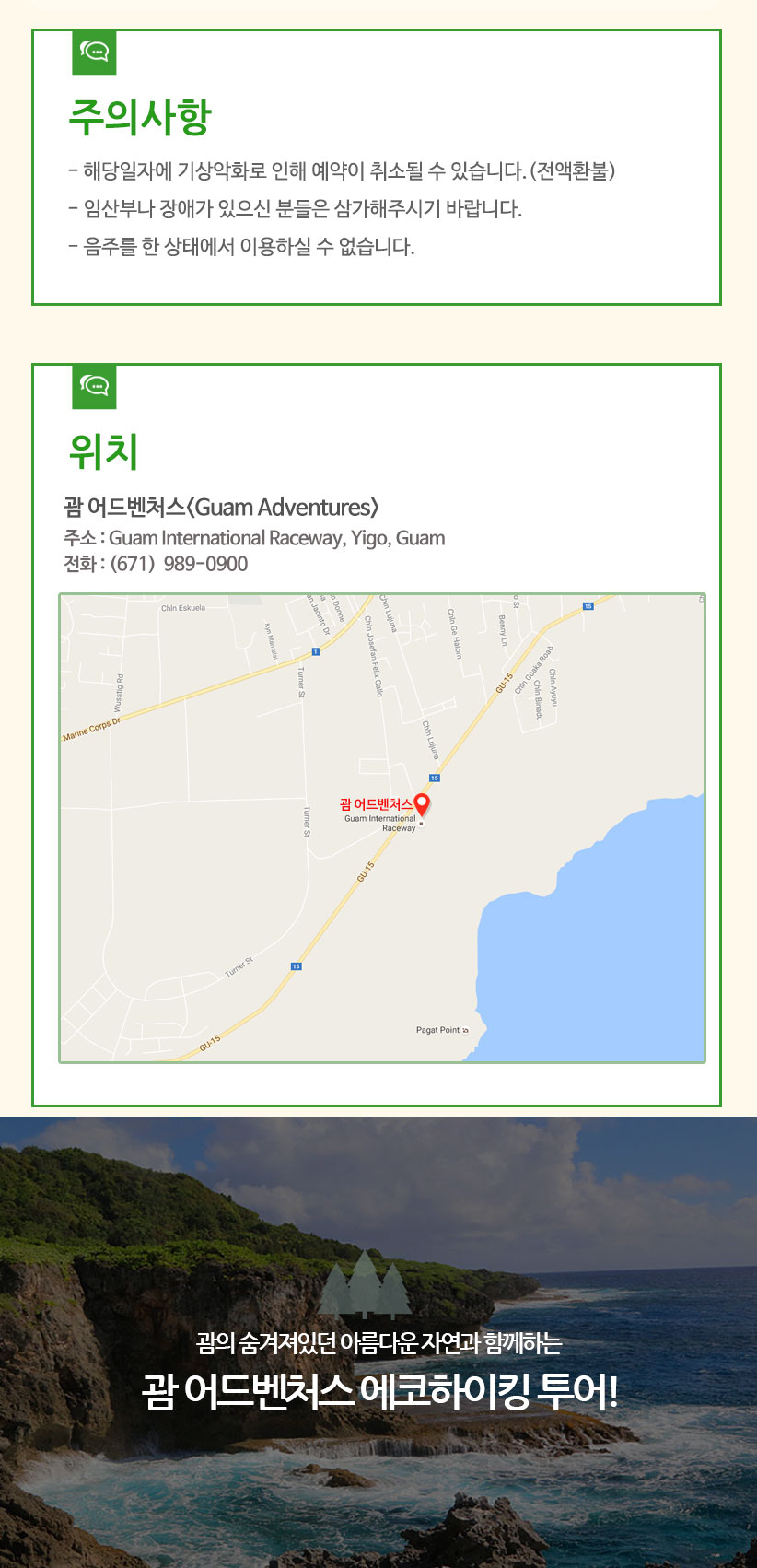 - 투어를 진행하는 동안 괌에 있는 벌레들이나 꽃, 식물들등 모든 것은 볼 수는 있지 만지거나 가져가서는 안됩니다.