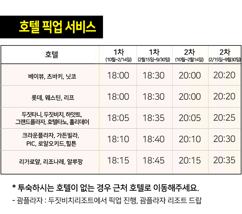 ※ 호텔 픽업시 현지 직원이 예약자 성함 확인 후 픽업 진행합니다. (10분전 대기)