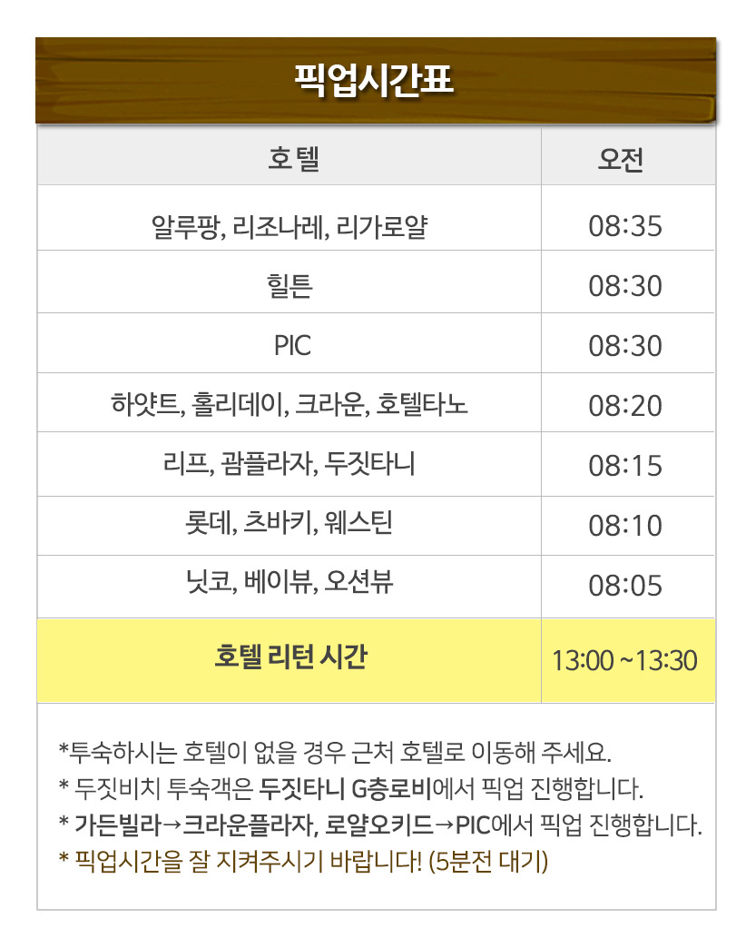 - 픽업시간은 현지 교통사정에 의해 조금 늦어질 수 있는 점 양해부탁드립니다.