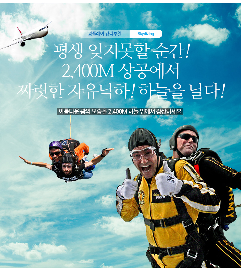 - 스카이다이빙을 체험하기 24시간이내에는 스쿠버다이빙,씨워커를 삼가 해주세요.