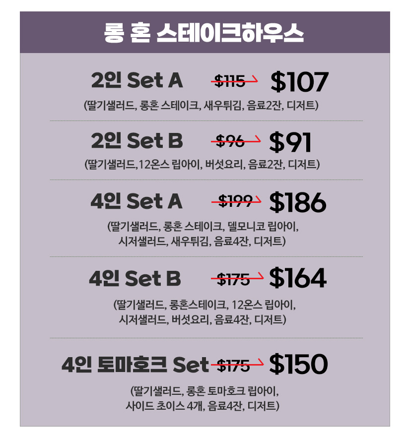 괌 플레이 통해서 예약하니깐 세트 메뉴로 먹는게 훨씬 저렴하네요...! 참고로 세트메뉴는 롱혼에서 따로 없는걸로 알고 있어요 ㅎㅎ 먼저 예약하고 가는게 훨씬 싸네요,...!! 왜 이걸 몰랐는지 전에 예약 없이 갔을 때 30만원 정도 나왔는데 이번에는 15만원으로 디저트까지 뽕을 뽑고 왔습니다..ㅎㅎ
