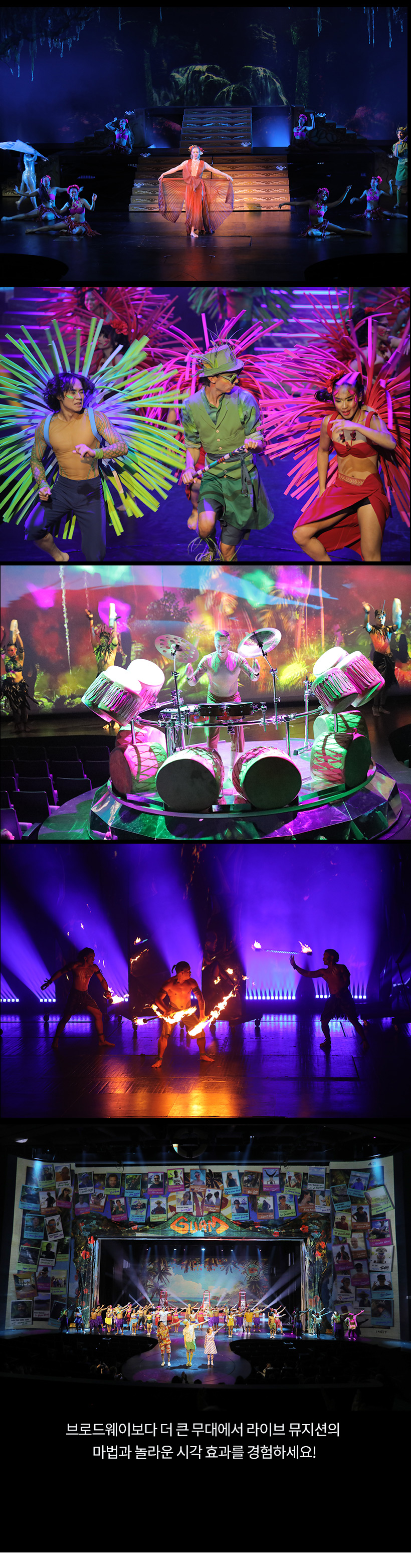 그동안 괌에서 많이 보았던 원주민 공연과는 달리 화려하게 변하는 미디어 아트와 다양한 공연의 조합 덕분에 시간 가는 줄 모르고 공연 즐길수가 있었어요.