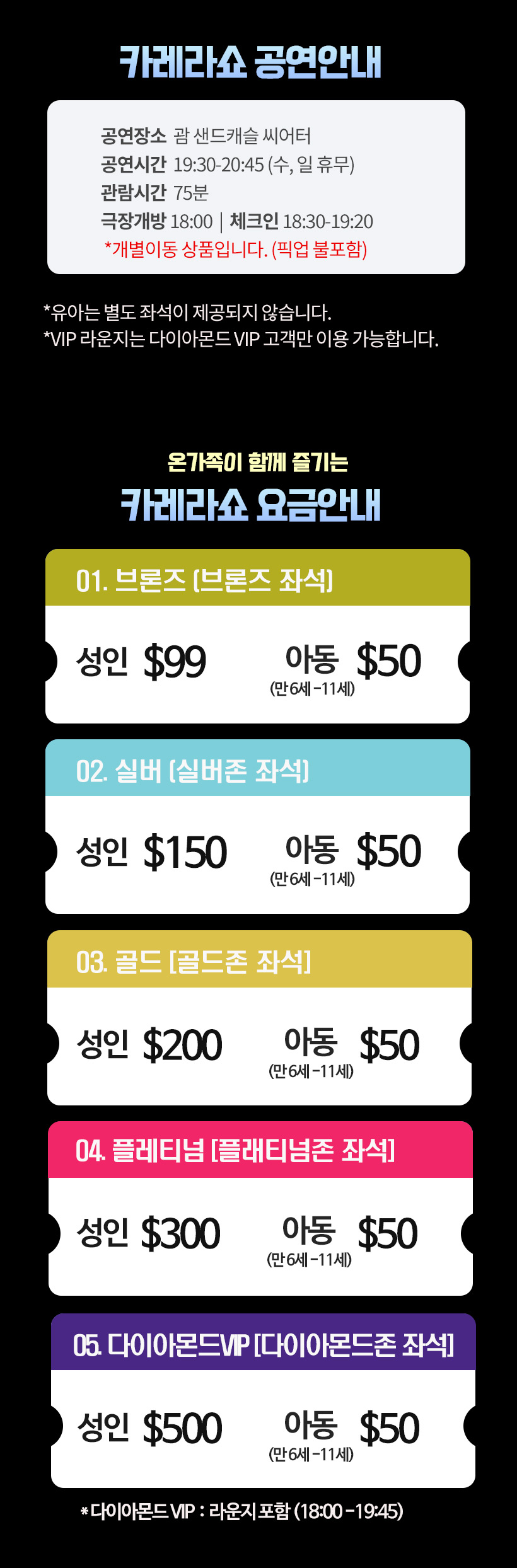 다이아몬드 입장권: 카레라 공연 1회 입장권 포함, 다이아몬드 구역 좌석, 캐스트와의 만남 이벤트 포함, 백스테이지 투어 이벤트 포함, VIP라운지 이용권 포함