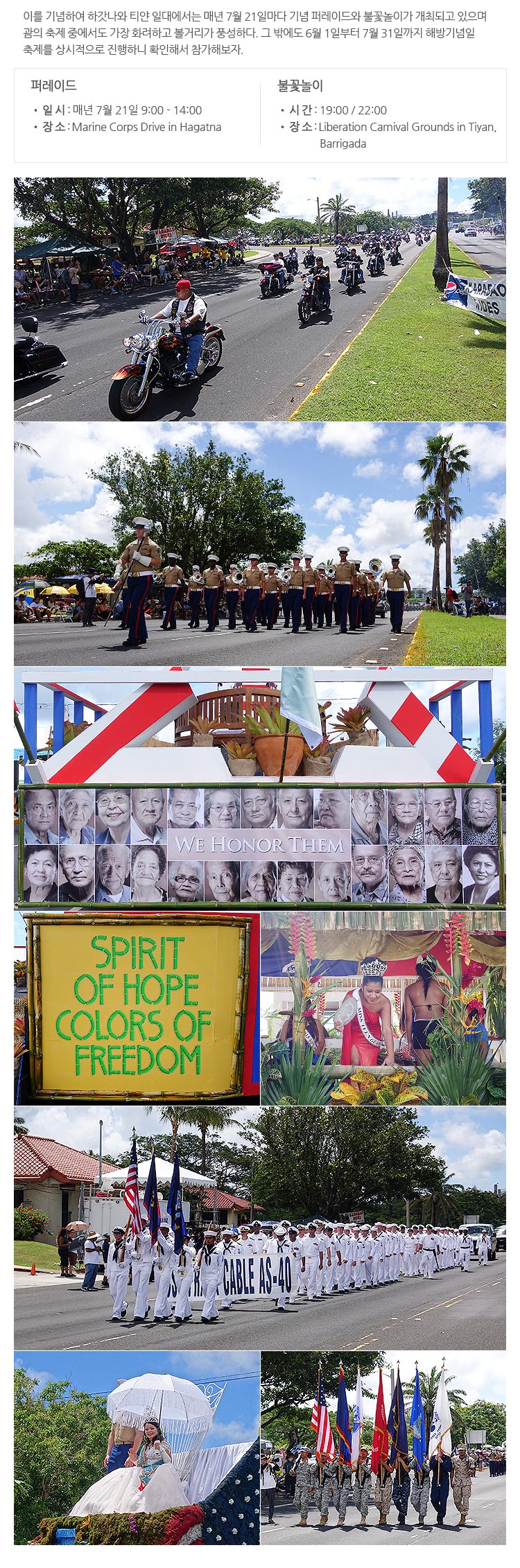 세계 2차 대전 당시 일본의 지배하 있던 괌을 해방시켜 미국령이 된 날을 축하하는 행사이다.
