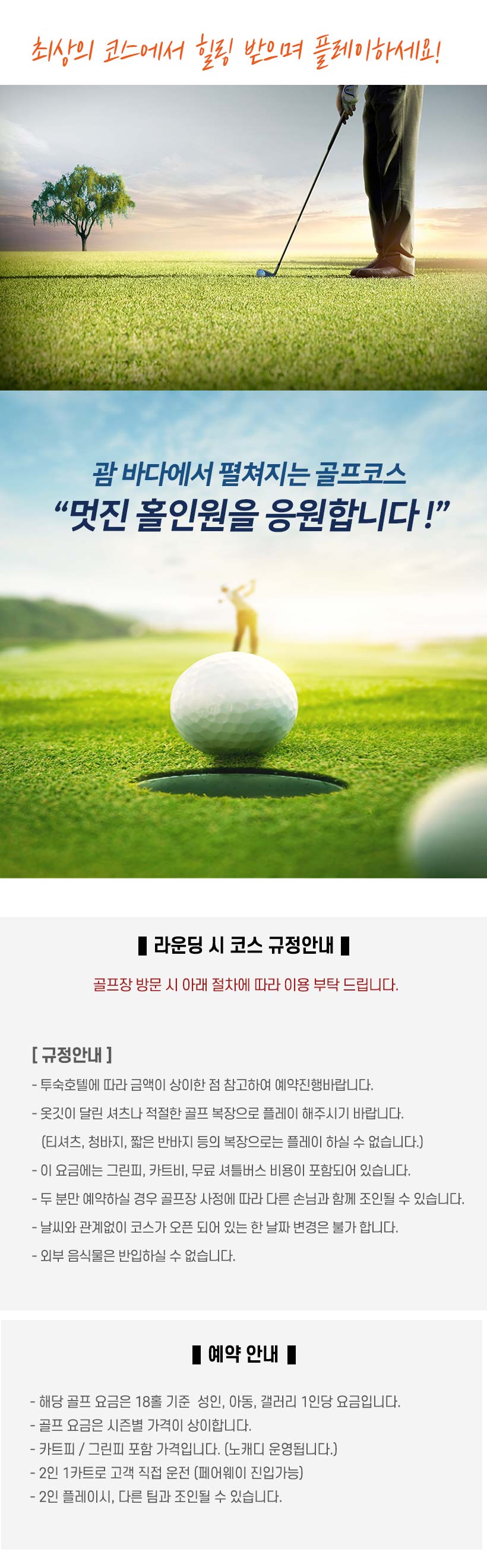 - 두 분만 예약하실 경우 골프장 사정에 따라 다른 손님과 함께 조인될 수있습니다.