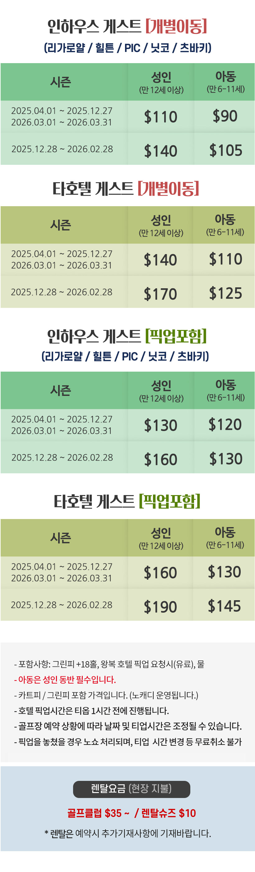 - 이 요금에는 그린피, 카트비, 무료 셔틀버스 이용 비용이 포함되어 있습니다.