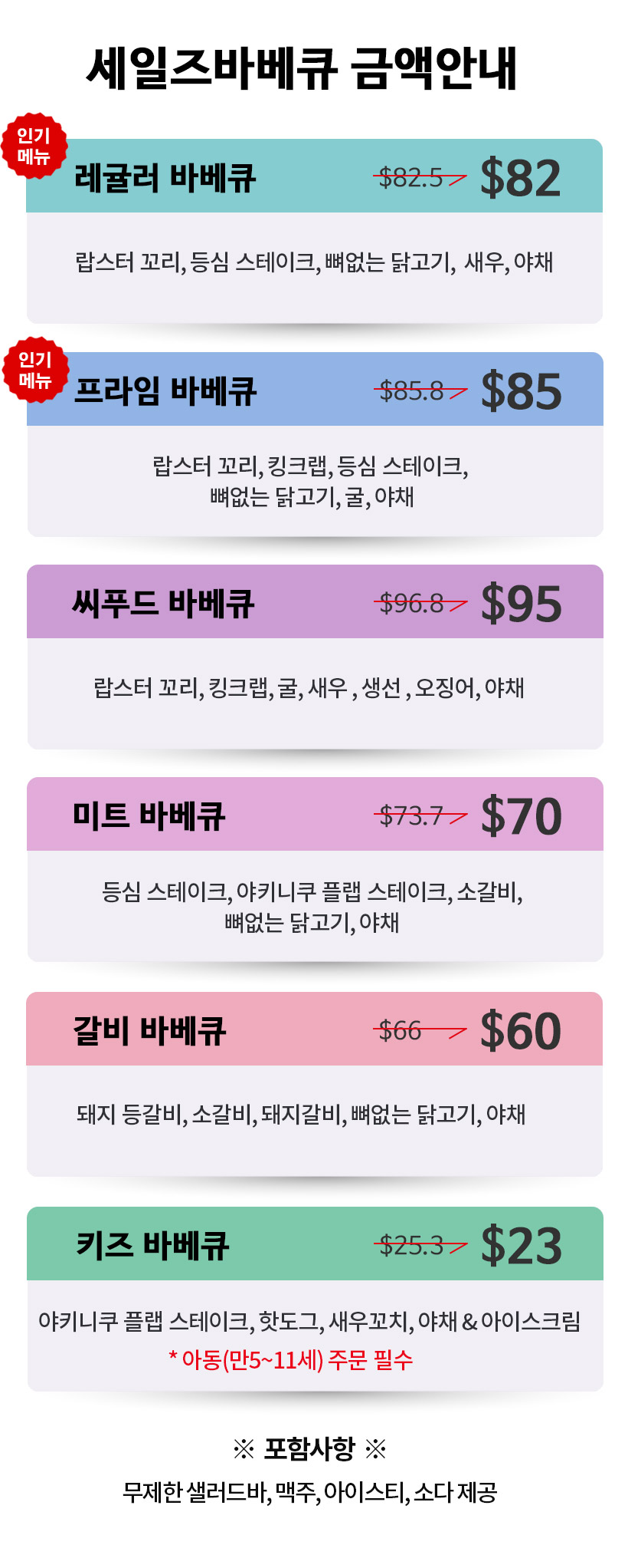 - 바베큐식사, 샐러드바, 맥주 및 음료(아이스티, 소다)