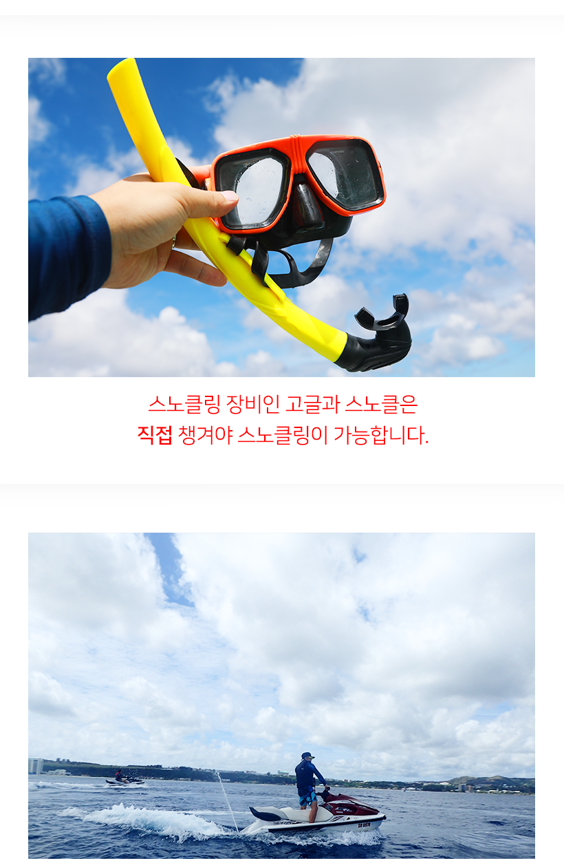 - 스노클링을 원하는 경우 개인 스노클 장비를 반드시 준비하셔야 합니다.