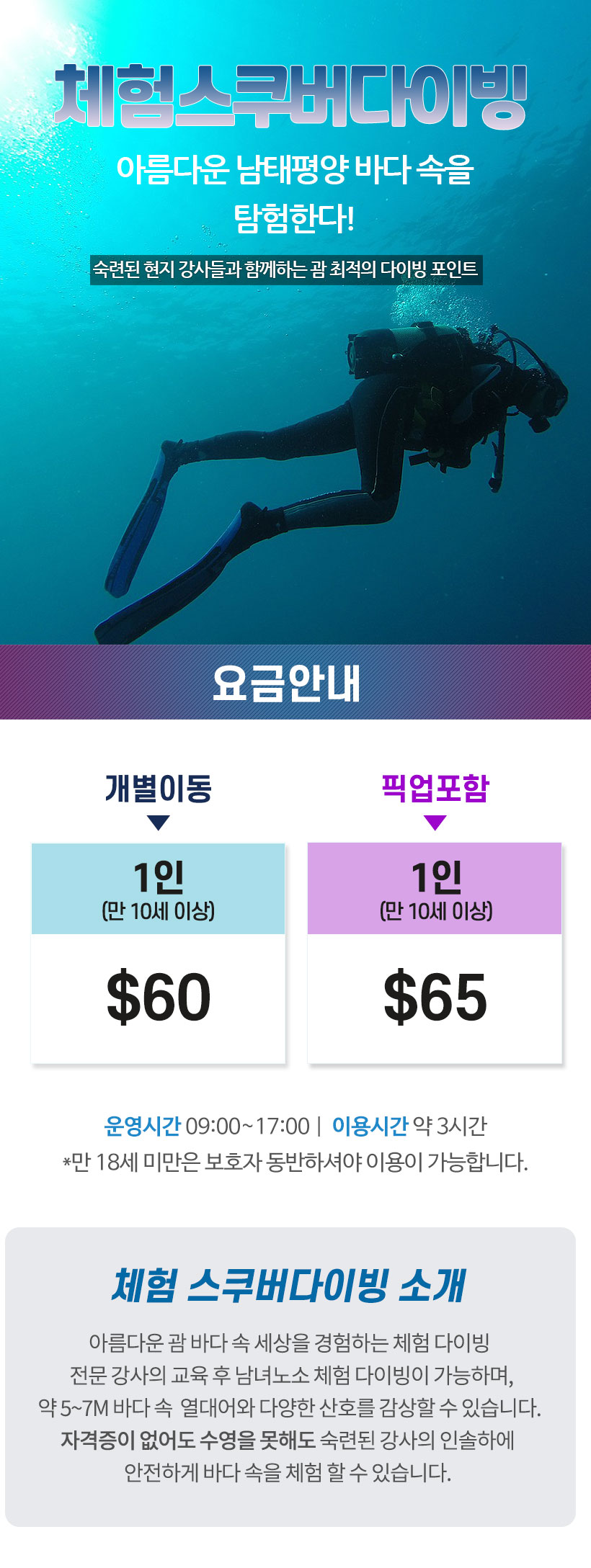 - 스쿠버 다이브는 임산부 또는 10세 미만의 어린이는 체험하실 수 없습니다.