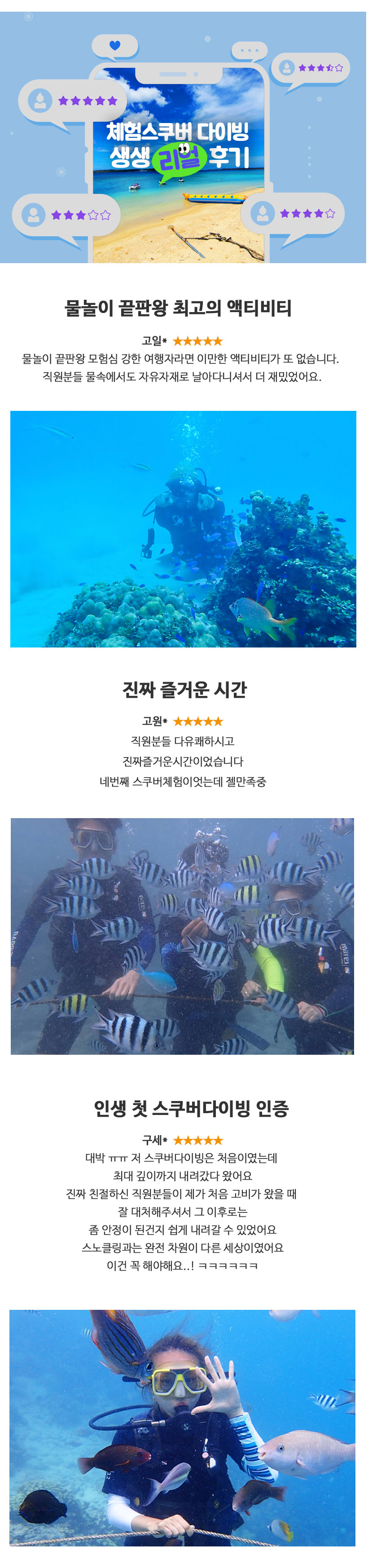 사전 충분히 설명을 들을 수 있고, 물에 들어가기전에 비치에서 연습을 하고 들어가서 덜 무섭고 물고기도 엄청 많이 경험했습니다.