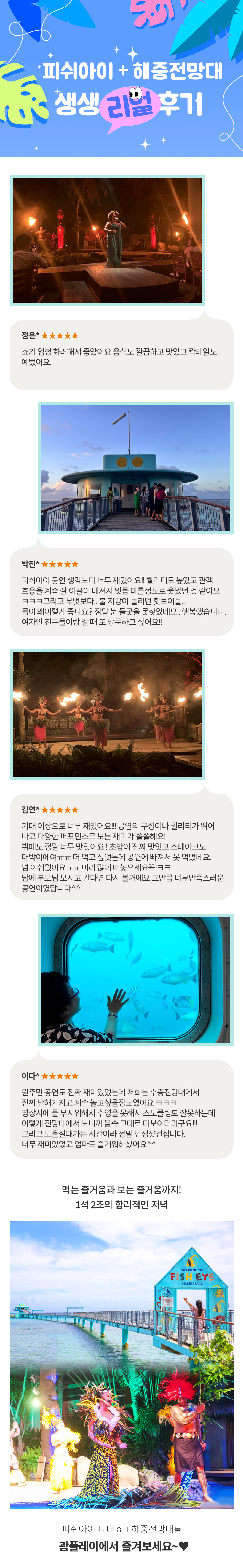 피쉬아이디너쇼는 괌에서 꼭 가봐야할 디너쇼 중 하나죠!! 맛있는 칵테일까지! 이용에 만족하신 것 같아 다행입니다 ㅎㅎ
