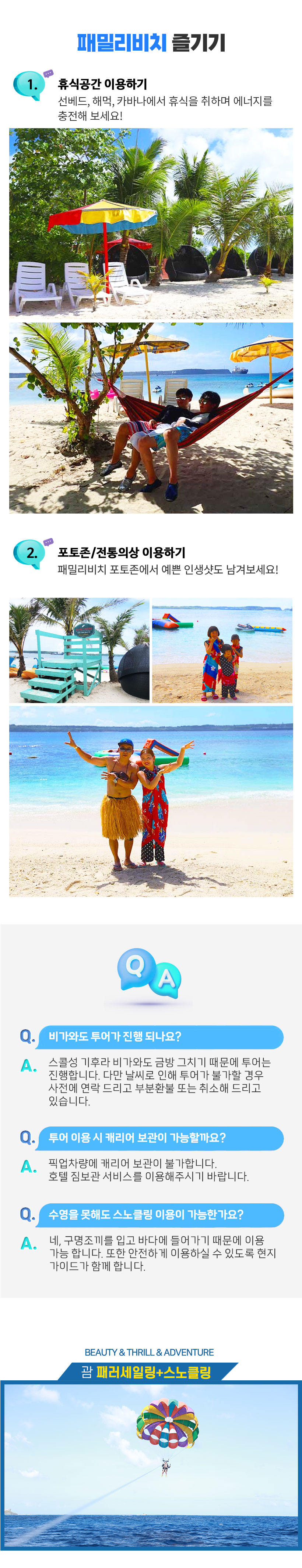 패러세일링 엄청 스릴있어요! 약간 무섭기도 했는데 바다멀리 바라보니 돌고래도 보이고 패밀리비치 스노클링도 안전하게 잘 하고 왔습니다. 상품 구성이 참 알찬 프로그램인거 같아용!