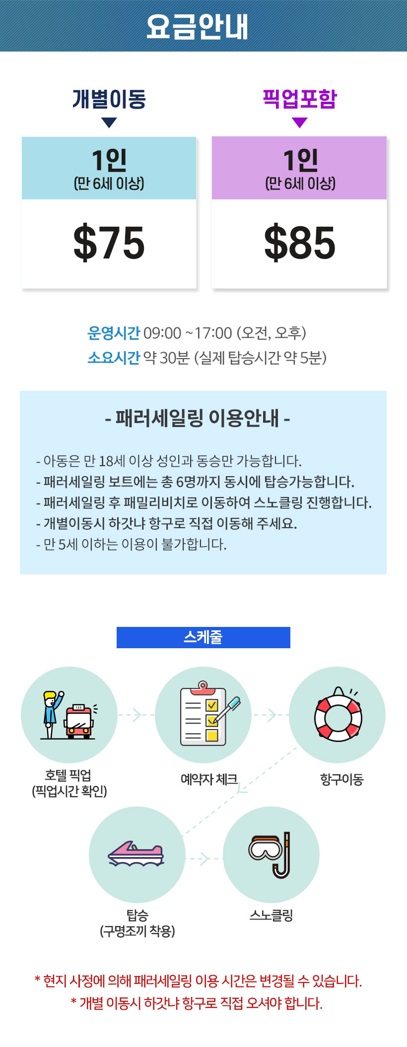 - 고객 부주의 등으로 발생한 부상 및 사고에 대해서는 본인이 책임져야 하며, 예약대행사인 괌플레이와 현지업체(이하 면책자들)에게 책임을 전가할 수 없습니다.