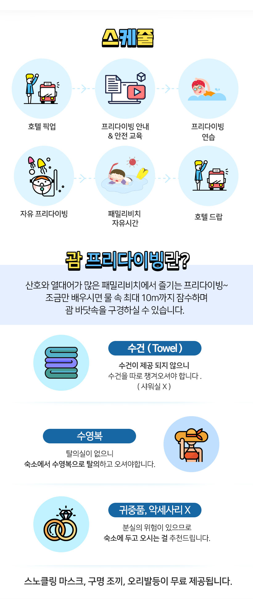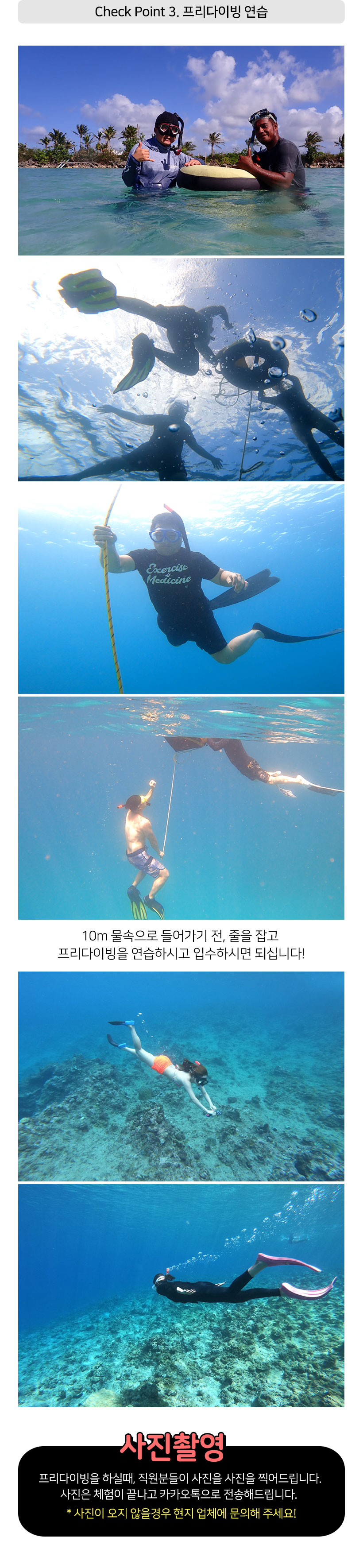 - 프리다이빙은 임산부 또는 13세 미만의 어린이는 체험하실 수 없습니다. (다만 어린이는 어른과 함께 할수 있습니다)
