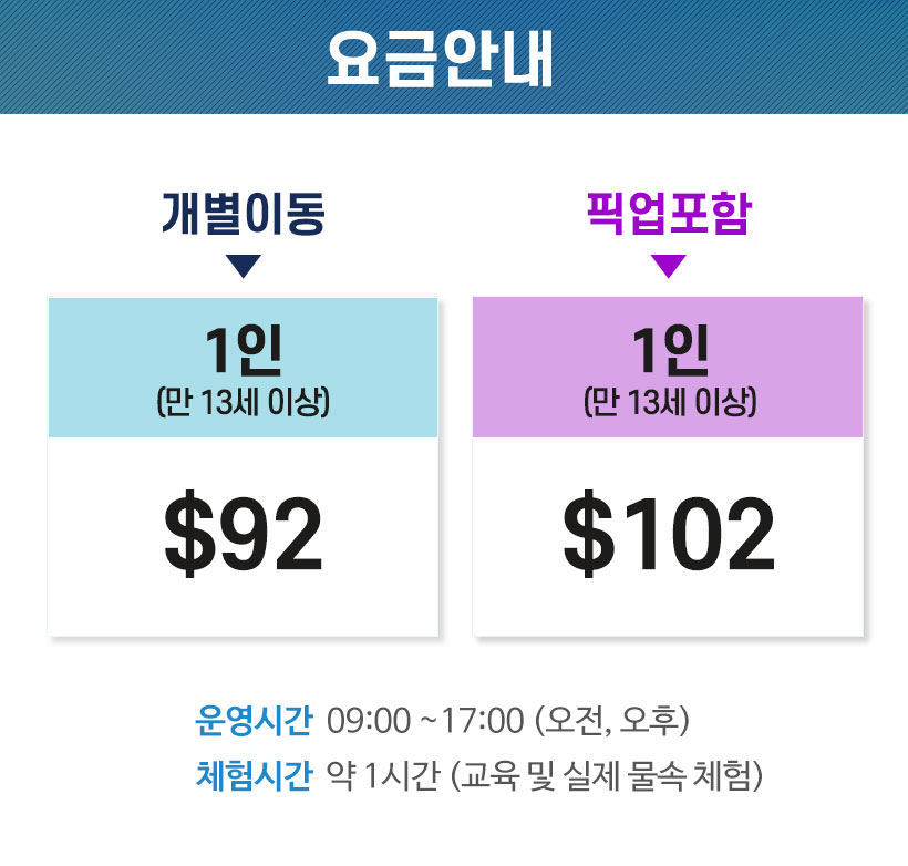 - 귀마개는 절대 사용이 불가하며 호흡기 질환을 앓고 계시거나 수술경험이 있는분은 체험이 제한될 수 있습니다.