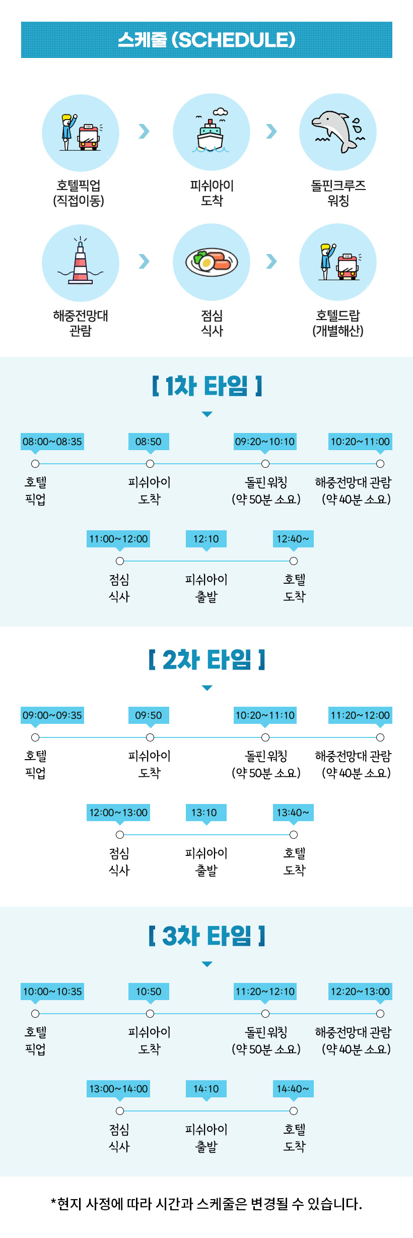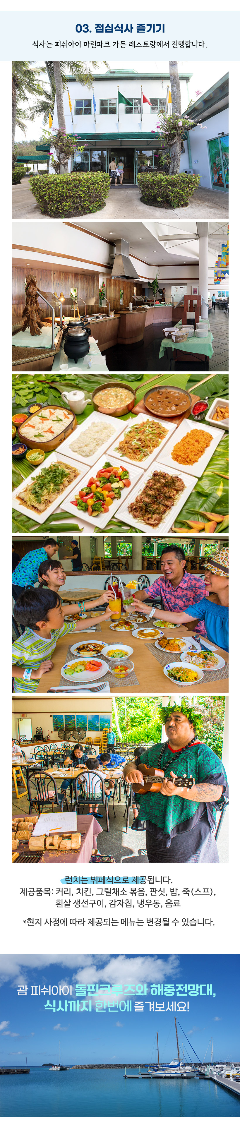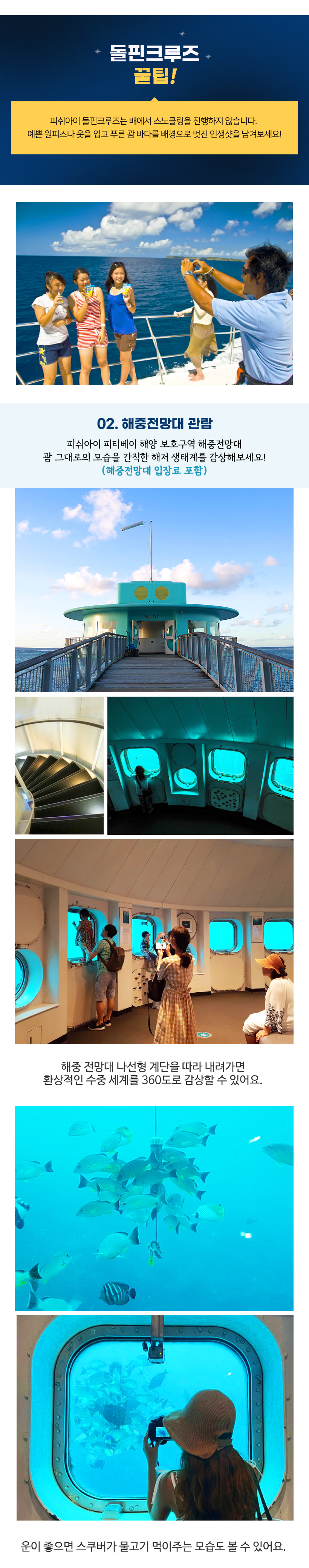 따로 스노클링은 할생각이 없어 돌고래만 보는상품으로 골랐는데 운좋게 돌고래 점프도 보고 피쉬아이 다리 건너 해중전망대고 감상하고 식사도 맛있게 하고 왔습니다.