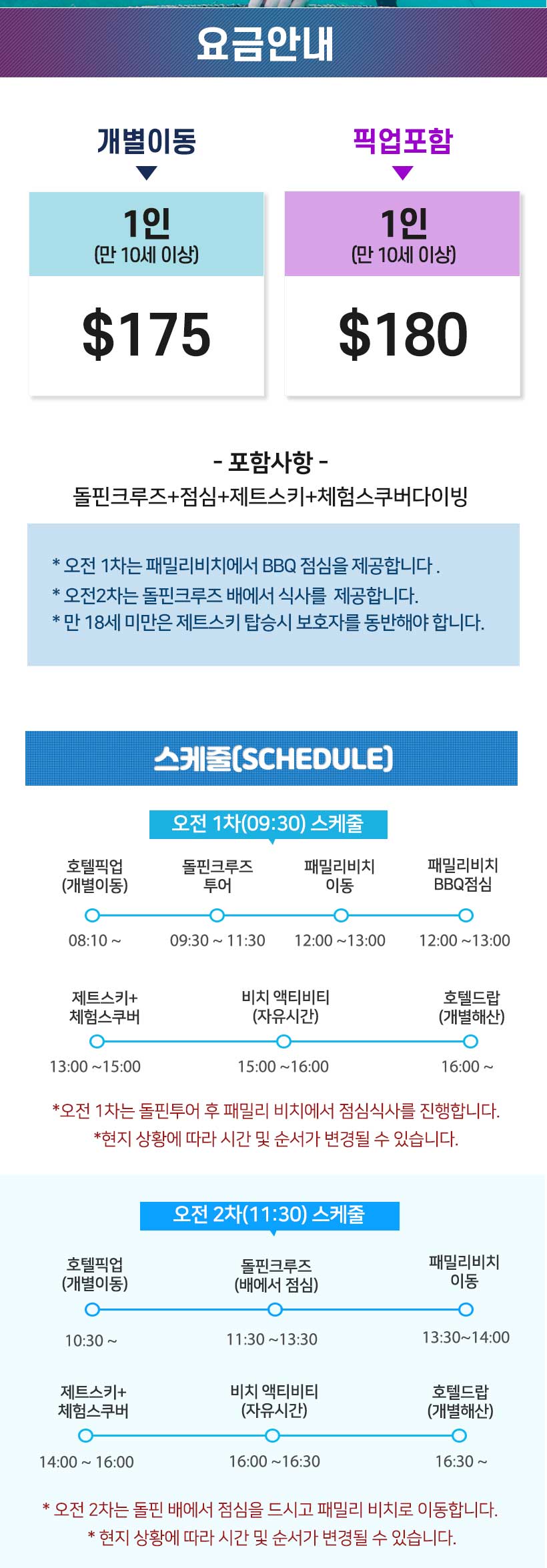 상품 : 패밀리비치 원데이팩(돌핀크루즈+제트스키+체험스쿠버) (09:30)