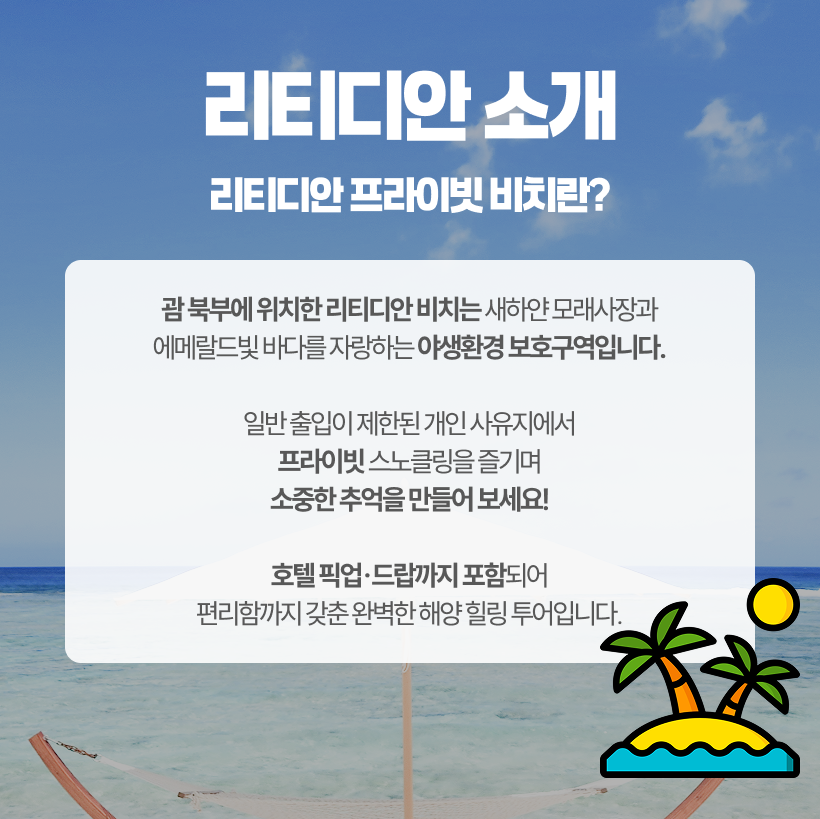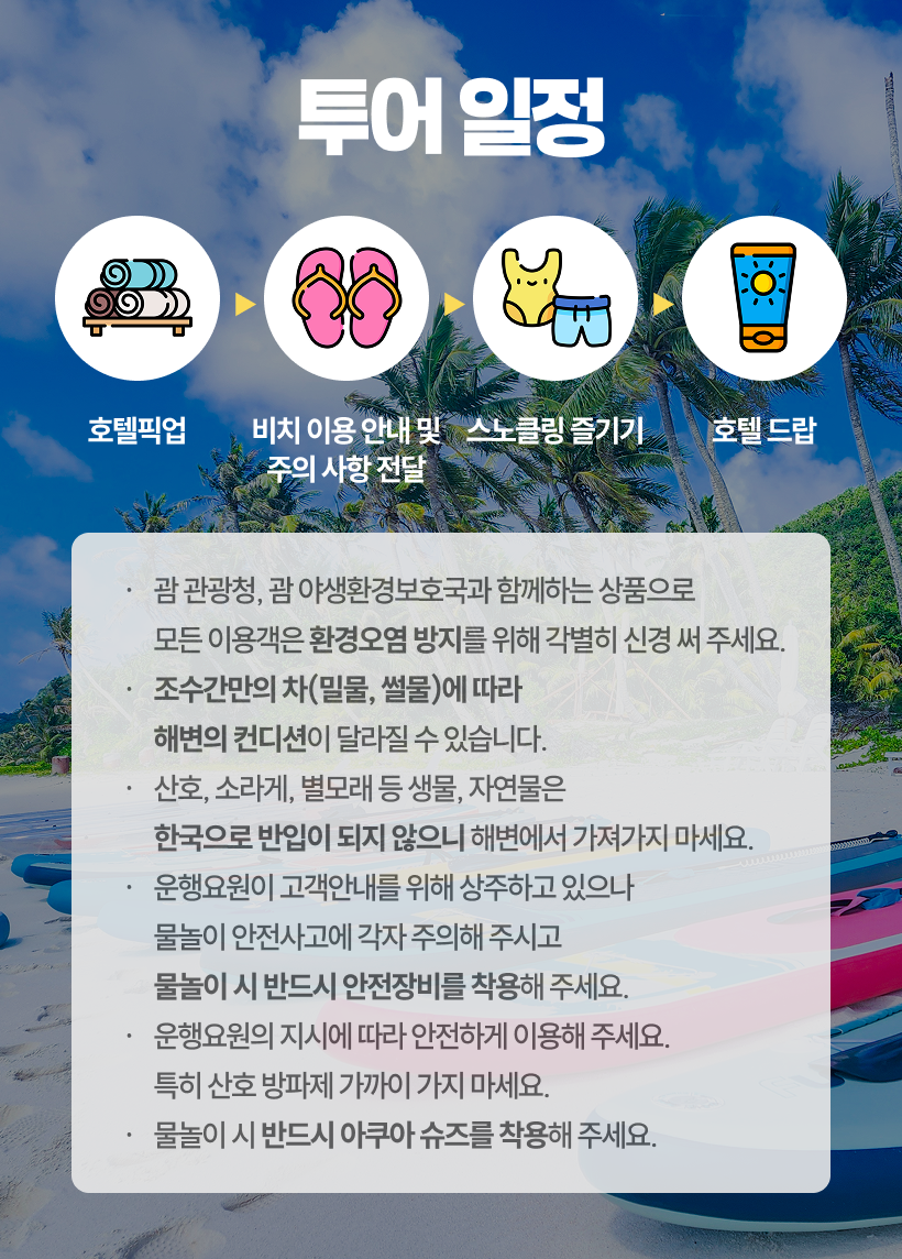 - 고객 부주의 등으로 발생한 부상 및 사고에 대해서는 본인이 책임져야 하며, 예약대행사인 괌플레이와 현지업체(이하 면책자들)에게 책임을 전가할 수 없습니다.
