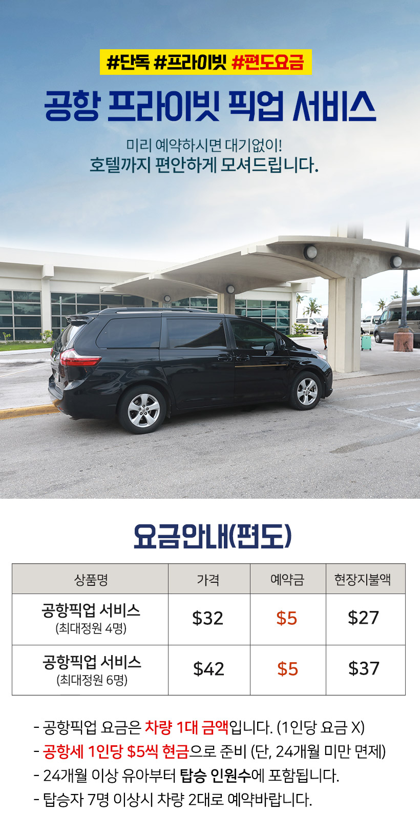 - 공항세 인당 $5 현금 준비 (만2세 이상/ 공항에서 1회 지불)